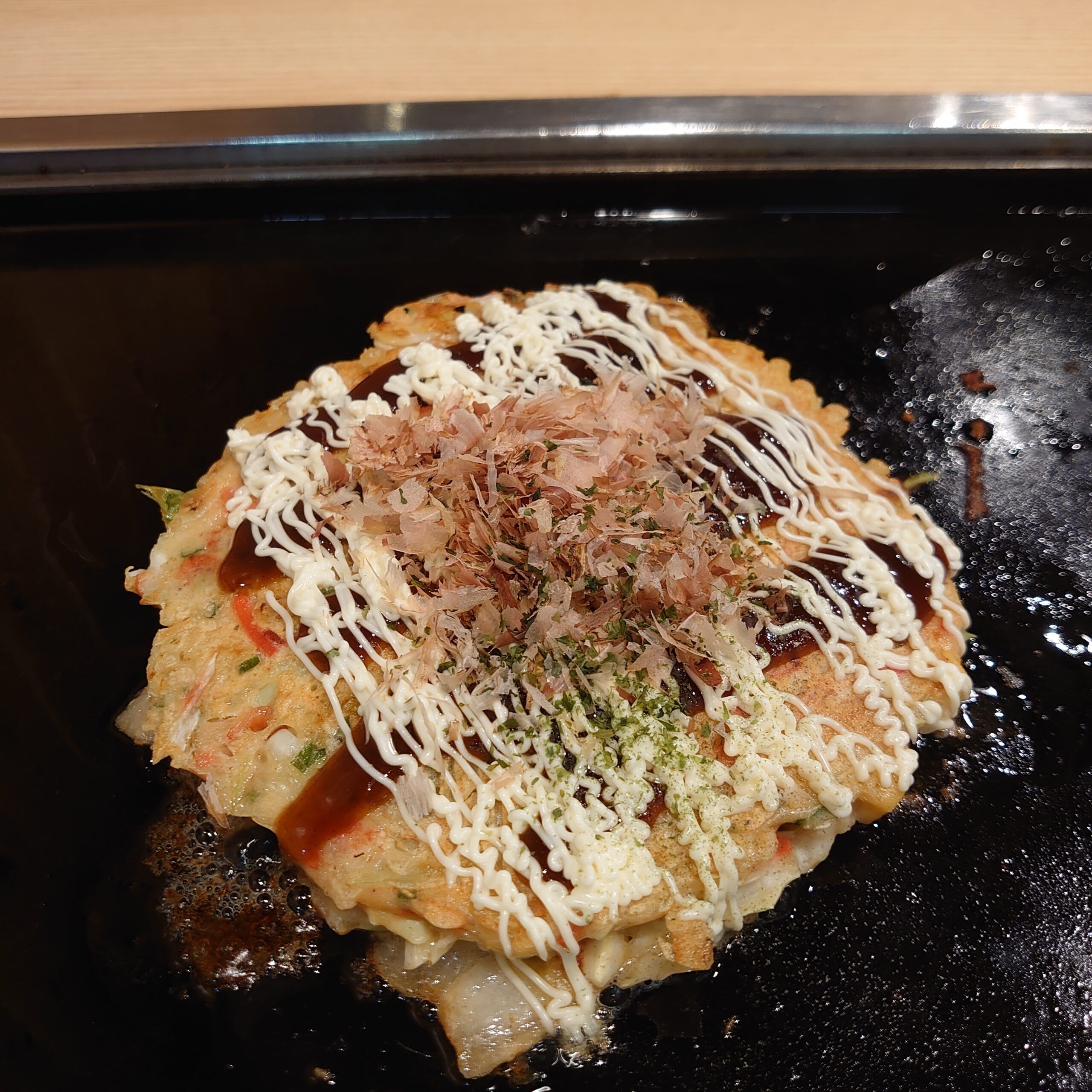 清澄庭園を散策してから、門前仲町までお散歩して、お腹が空いてしまったのでお好み焼き屋さんに入りました。なんと自分でやくシステム😟焼いて持ってきてもらえませんかと店員さんに言ったら、ここで焼いてくださーいと言われました。私の動きがたどたどしくて焼いてる時にコチラを気にしてくれたり、できたら上手にできましたねと声をかけてくれたり優しい店員さんでした笑。1人でお好み焼き屋さんに入るのも焼くのも初めてだったので刺激的な体験でした。店内の雰囲気も良くてお好み焼きも美味しくて店員さんも優男で楽しい時間でした。年に何回か門仲行きたいって思い立って行くんだけど、今日がその日でした。次また門仲に来る機会があればまたここのお店に行こう。次はもうビビらずに作れそうです笑。