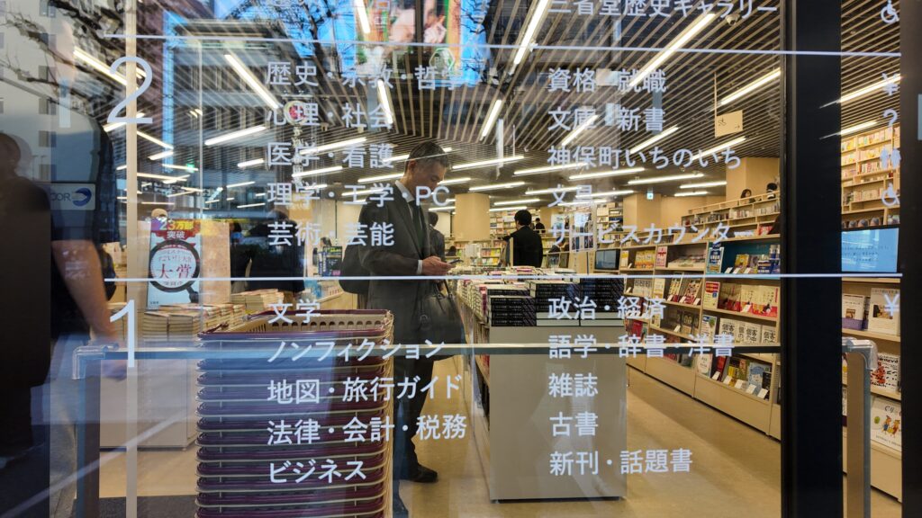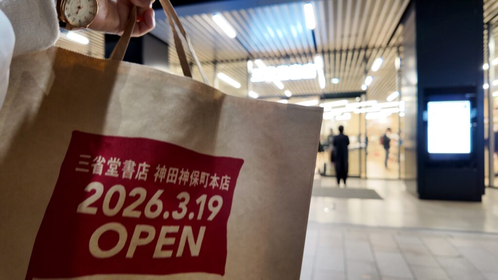 2026年3月19日に神保町にオープンした三省堂書店本店に行ってきた。オープン日は800人も並んでいたらしい。YouTubeチャンネル、ページターナーズの三省堂書店紹介動画を見て、行ってみたいなぁとぼんやり思っていたので気持ちがホットな時に行けて嬉しかった。テンション上がった。毎年、靖国神社の桜を見に行ってるのですが、『そういえば神保町近いじゃん、ちょっと本屋さん巡りしよう』という流れで行った。行きたいなぁと思ってたら自然と行き着くものだなぁ。私はここ1年でガラッと紙の読書派になった。数年前は頑なに電子書籍派だった。だって家にものが増えないじゃんと心底思っていた。Kindleには8000冊の本が入るから一生これ使おう、ここが私の本棚だと思っていたのに。あの時の私は紙派になるなんて思わないだろうなぁ。紙派になってから本屋さんめぐりが本当に楽しくなった。本屋さんによって雰囲気が違くて、配置やポップなどその店の特徴を感じるのが面白い。お店よって目がいく本も様々。経済本なんて興味がないのにこの本屋では目がいっちゃうとかある。本屋のせいなのか、実は私の中に眠っていたものなのか、分からないが自分も知れて面白い。わざわざここで買わなくても最寄駅の本屋で買えばいいじゃんと思う時もあるけど、そこの本屋で買ったから思い出だし物語。最近は本屋さんめぐりが新たに趣味の一つに入って日常が豊かになった気がする。数年前は本屋さんが衰退しているというイメージだったが、今はある意味本屋さんはテーマパークで個性があって人気が出ている気がする。
