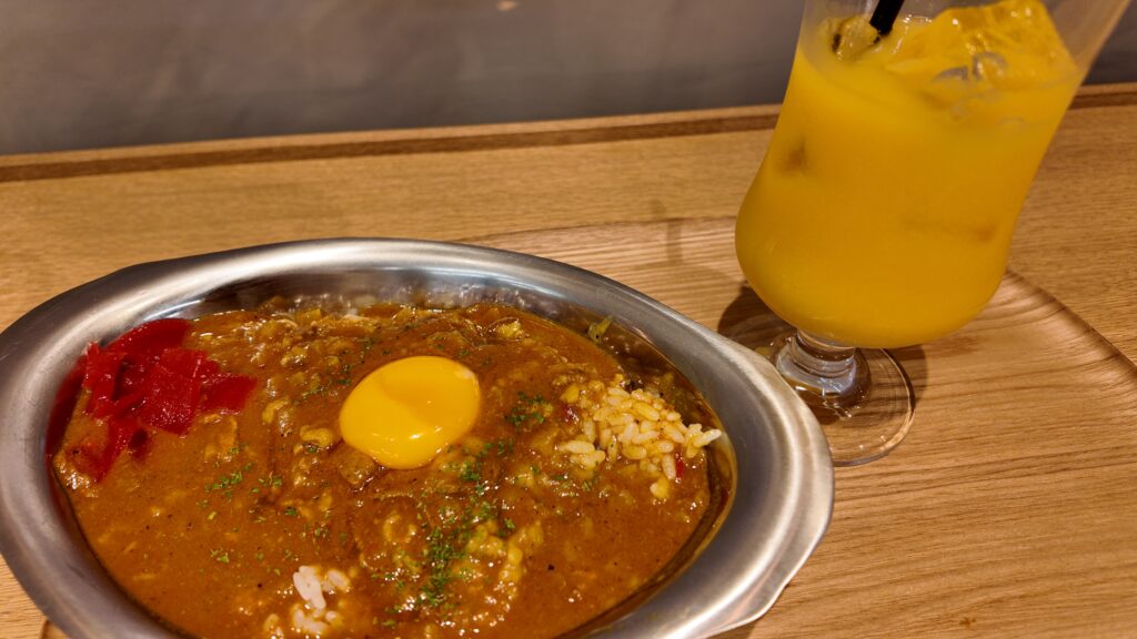 ここがニュースやYouTubeで見た三省堂書店かーとウキウキした。本屋さんにこんなに感動してる自分自身に驚いた。4階まである大きな本屋さん。4階はワンピースのイベントスペースだったな。間違えて上がってしまいここはチケットある人のみですと注意されてしまった。。新しいピカピカの本屋さん、お客さんも楽しそうだったなあ。本屋さんの1人の人がいっぱい集まってるという空間が好き。もちろん友達同士で来てる人もたくさんいるけど、基本は静かで本と向き合う空間だから素敵な場所。本を見ながらお客さんも見てる変な私。。スタンプも何箇所かあって持ち歩きロルバーンに押した。一階はいろんなジャンルが置いてあってこだわりを感じた。あと高い本棚もないから広々としていたし圧迫感というか仕切り感もなかったなぁ。夢中で一階、二階、三階を見て、三階にあるカフェを見つけた時に初めて疲れがドーンと押し寄せた。カフェで一休みしよ。。メニューになんとカレーがあって即決した。思えば靖国神社の桜を見てからずっと歩き回っていてお腹はペコペコだった。ここでも新たな発見。本屋さんの中にあるカフェだから普通のカフェより静か。1人のお客さんも多めだった。でも私の隣には女性2人組で仕事の愚痴をたくさん言っていた。大変だなぁ。手強い上司はどこにでもいるんだなぁと聞いていた。カフェの雰囲気も可愛かったな、8人くらいが座れる大きい丸テーブルとか1人カウンター席もあったりで気に入った。