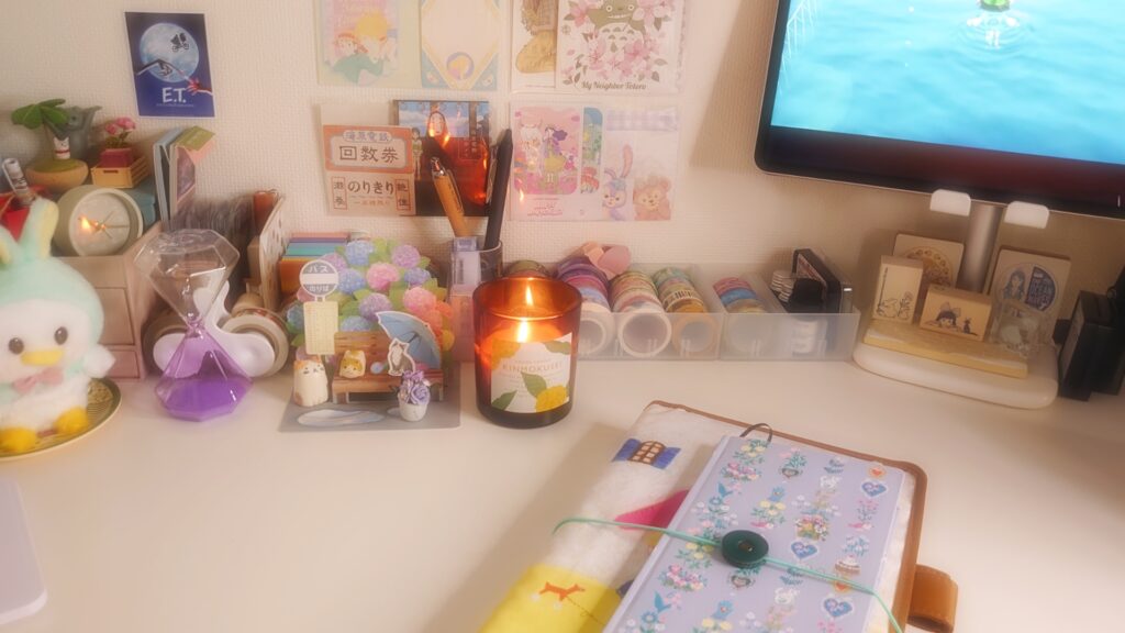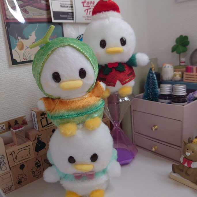 机の上が文房具でいっぱいになってしまったので、メロンうるぽちゃんを上に乗っけました。下のうるぽちゃんは不満げに口を曲げています🐰🍈🎄