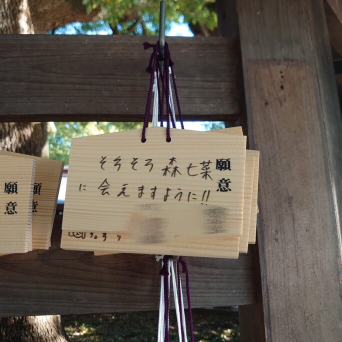 絵馬に書くくらいだからとても好きなんだろうなぁ。私も森七菜ちゃんに会いたい笑。そろそろってどういうことだろう。この前は=LOVEの子の体調が良くなりますように、、という絵馬を見た。推しへの想いを絵馬に書いてるファン可愛い。
